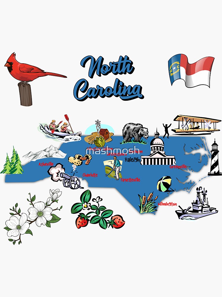 USA North Carolina State Travel Poster Map with Tourist Highlights