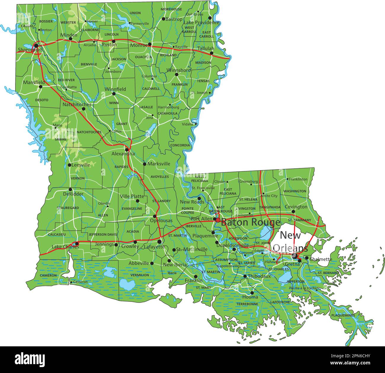 High Detailed Louisiana Physical Map Labeling Stock Vector